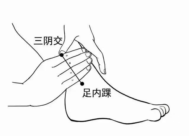 3.三阴交(调和三经穴):脚踝内踝尖上四横指处,按压1-2分钟,调理肝、脾、肾三经,从根源改善脏腑功能。