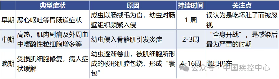 成虫期:成虫会在人体的小肠中停留几周甚至几个月来“产子”(卵胎生)。产出的幼虫“宝宝”穿透肠壁,随着血液和淋巴系统扩散到全身肌肉中,形成“囊包”。