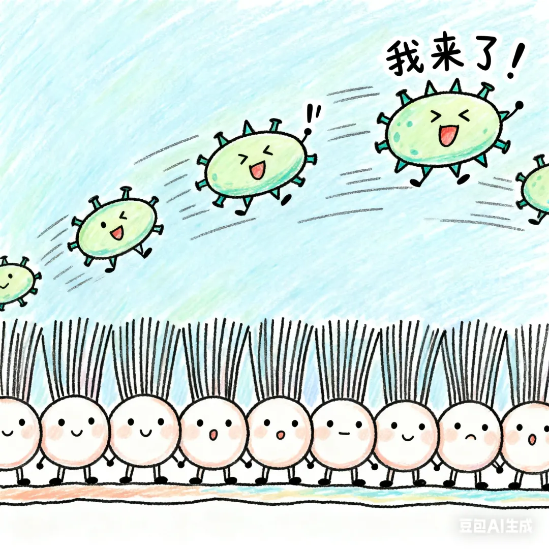 物理屏障如同城墙,负责阻挡外敌入侵。它主要由黏膜上皮细胞、表面的黏液和纤毛共同构成:上皮细胞构成基本屏障,黏液能黏附病毒、灰尘等异物,纤毛则通过规律摆动,将这些“外来客”向外推送,防止它们附着甚至深入人体。