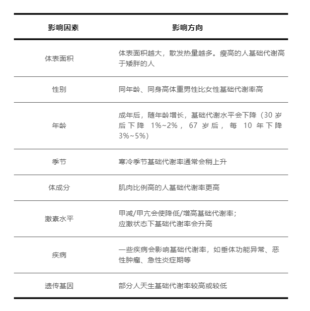 通常,人的基础代谢率和身高体重、年龄、性别、激素水平、季节、体成分(肌肉比例)、疾病状态等因素相关: