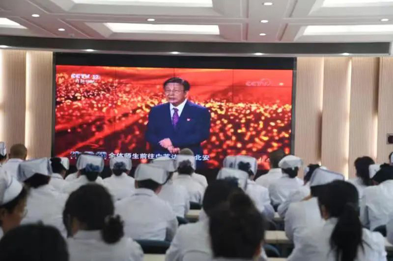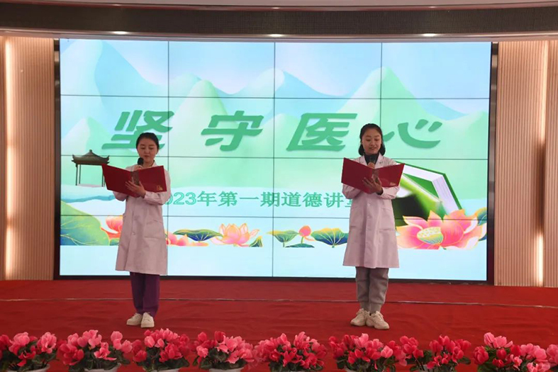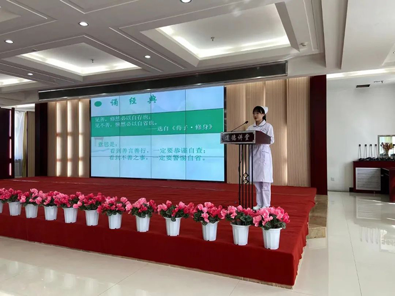 活动从主持人带领大家一同唱响熟悉的旋律《公民道德歌》开始,用歌声表达弘扬中华美德传统、提升思想修养的信念和信心,在全院营造积极向上、健康和谐的良好道德风尚。紧接着,大家学习并诵读《荀子·修身》“见善,修然必以自存也;见不善,愀然注必以自省也。”伴随着舒缓悠扬的音乐,大家在领悟经典语录中进行自省。而后播放视频《医心向党|陈洪铎:卧薪尝胆 团结苦干 实力创新》,学习我国皮肤性病学领域的第一位工程院院士、我国朗格汉斯细胞研究的奠基人陈洪铎的先进事迹。诗朗诵中,道德讲堂宣讲员带来《心的承诺》,号召大家一起秉承医者初心,践行心的承诺。送吉祥环节,大家获得一份精美的书签。