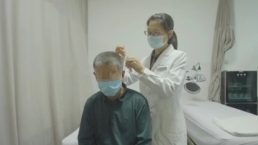 综合诊断,靳晓娟认为,患者头痛为气滞血瘀,病位在胃经、胆经,决定采用针刺进行治疗。在患者左侧卧位下,靳晓娟开始施针:丝竹空透率谷,太阳透角孙、风池、合谷、内庭、足临泣,均左侧取穴,前两个透穴刺法均选用0.35*75号针,余穴选用0.35*40号针。
