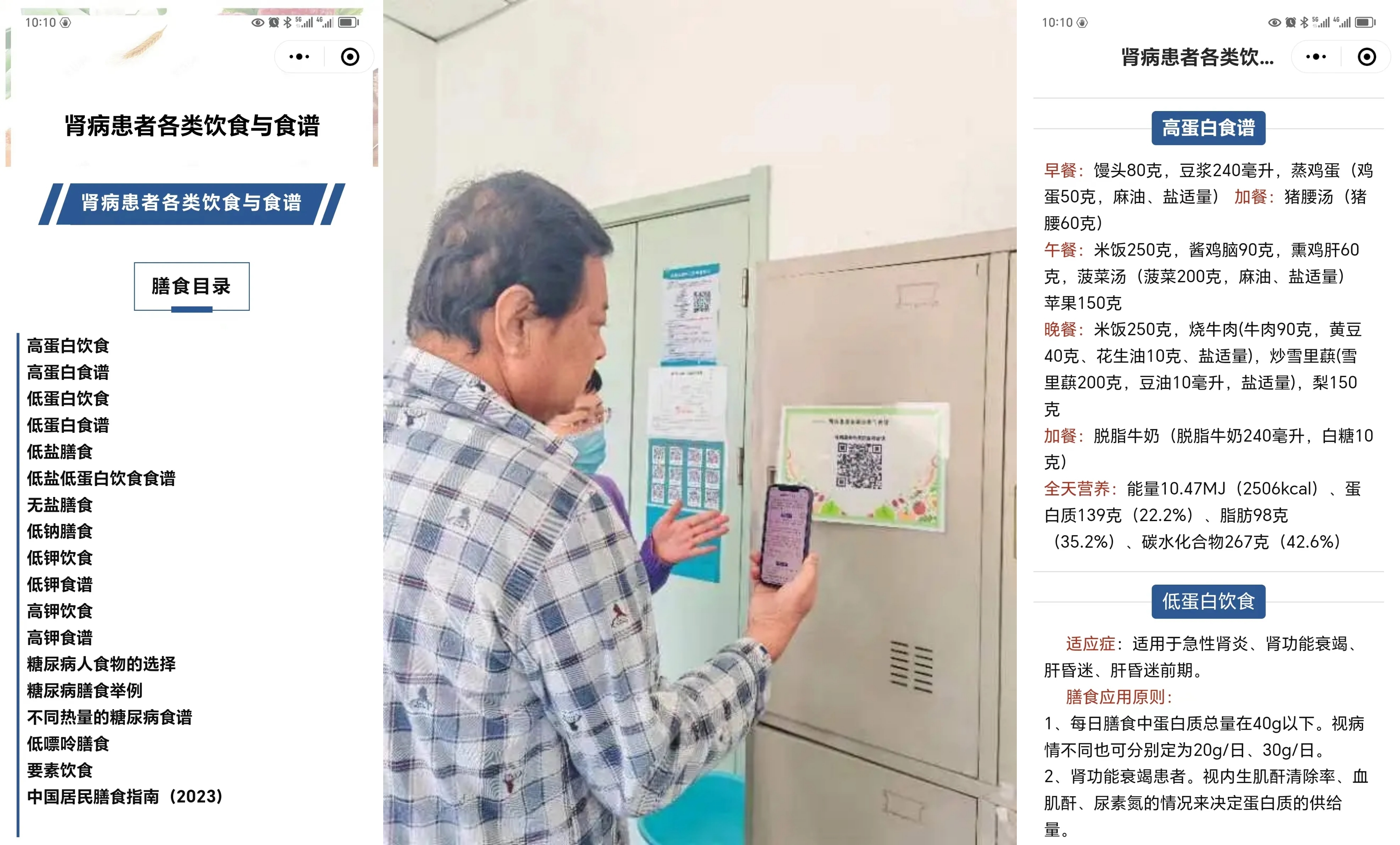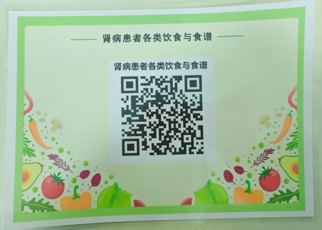 为进一步落实国家卫生健康委《进一步改善护理行动计划(2023-2025)》、山西省卫生健康委《山西省进一步改善护理服务行动实施方案(2023-2025)》,山西省医院协会副会长单位——山西省第二人民医院肾移植透析中心二区夯实基础护理,创新服务举措,对肾病患者各类饮食与食谱进行分类整合与校对,历时4个月时间完成肾病患者各类饮食与食谱二维码,并张贴在醒目处进行宣教。