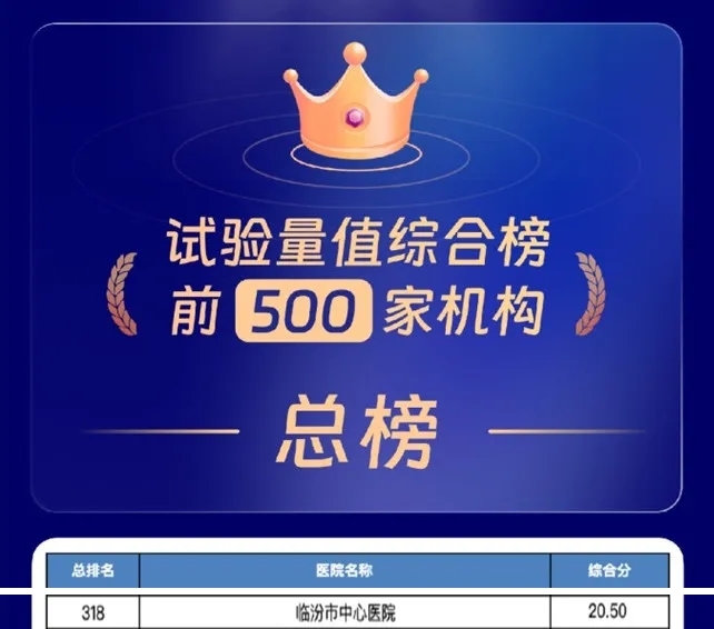 近日,2023年度全国GCP机构药物临床试验量值排行榜发布。山西省医院协会常务理事单位——临汾市中心医院位列总榜第318名、综合医院排行榜第258名,在山西省地市级医院中位列第2名。这标志着临汾市中心医院临床研究能力再上新台阶。