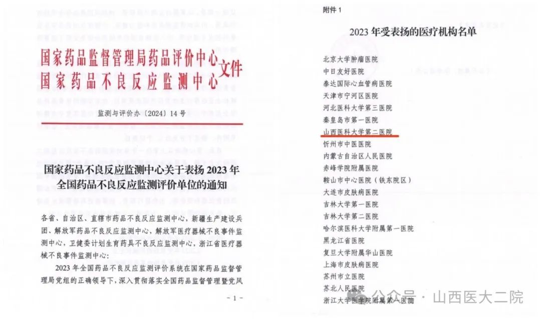 日前,国家药品监督管理局药品评价中心、国家药品不良反应监测中心对2023年药品不良反应监测评价工作中表现突出的医疗机构、药械妆企业和基层监测机构予以通报表扬。全国69家医疗机构获表扬,山西省医院协会副会长单位——山西医科大学第二医院位列其中。