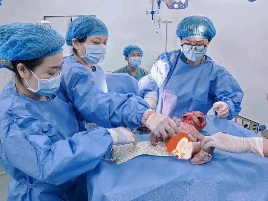 “这种情况拖不得!必须马上推进手术室进行剖宫产!”产科团队迅速反应,立即联系麻醉手术科,进手术室行紧急剖宫产。整个过程,吕传娟助产士一直手举胎头,保证胎儿脐带不受压以确保胎心正常;产科副主任医师郭娟、主治医师李甜茹,麻醉科主任马廷学、护士长孟广艳、麻醉师杨强、器械护士冯烨密切配合,迅速娩出胎儿。