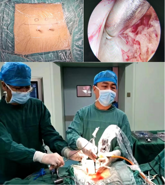 骨科团队仔细研读患者影像资料,详细评估患者病情,发现患者右下肢的症状既有腰椎间盘突出压迫神经的因素,又有腰椎管狭窄压迫神经的因素。取得家属知情同意后,科室脊柱外科团队决定通过单侧双通道全内镜技术(UBE)为患者实施单侧入路双侧减压+突出髓核摘除术。