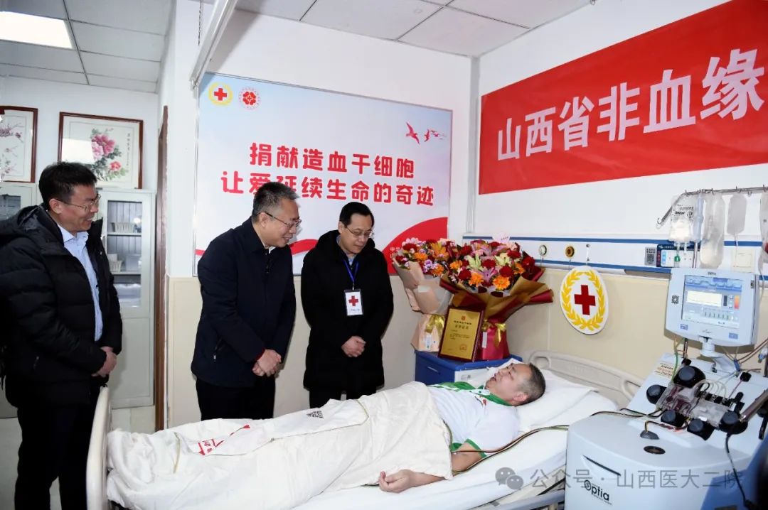 日前,山西省第300例非亲缘造血干细胞捐献采集工作在山西省医院协会副会长单位——山西医科大学第二医院血液内科顺利完成。山西省红十字会党组书记、常务副会长尚日红,太原市红十字会党组书记、常务副会长张刚及捐献者所在单位领导一行来院对捐献者杨先生进行慰问。山西医科大学第二医院党委书记成晓龙及相关职能部门负责人一同慰问。