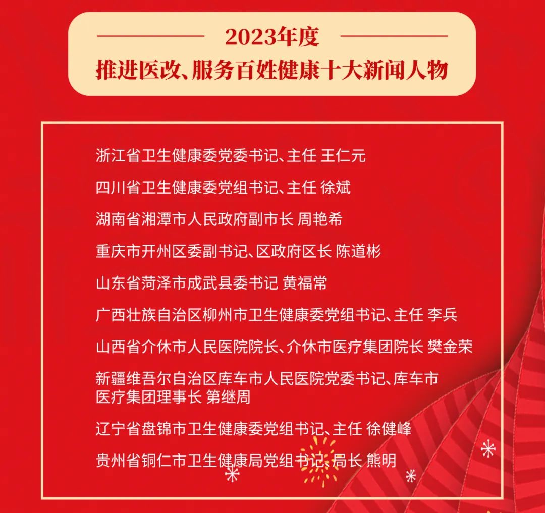 近日,由国家卫生健康委体制改革司、宣传司指导,《中国卫生》杂志社、健康报社主办的2023年度“推进医改、服务百姓健康十大新举措、十大新闻人物”推介活动揭晓结果。山西省医院协会理事单位——介休市人民医院院长、介休市医疗集团院长樊金荣被评为“推进医改、服务百姓健康十大新闻人物”。