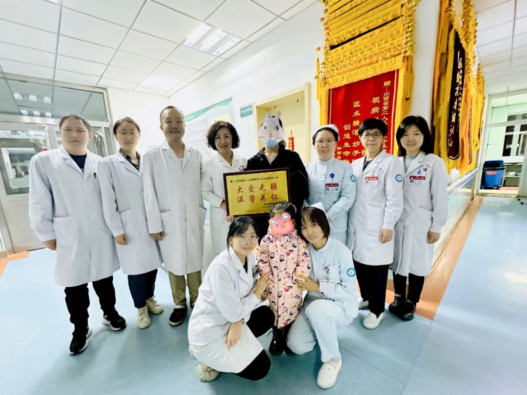 10月28日,茜茜幸运地等到了理想的供肾。在山西省第二人民医院肾移植中心首席专家武小桐教授的带领下,陈好雨主任带领的肾移植外科团队为茜茜实施了肾移植手术。李宁主任带领的移植内科团队、王明君副主任医师带领的医疗小组、病区护理负责人温晓明带领的护理团队为茜茜成功完成围手术期的管理。经过三周的精心呵护,茜茜恢复良好,顺利出院。出院当天,家属特意为肾移植团队送来写着“大爱无疆,温馨关怀”的牌匾。