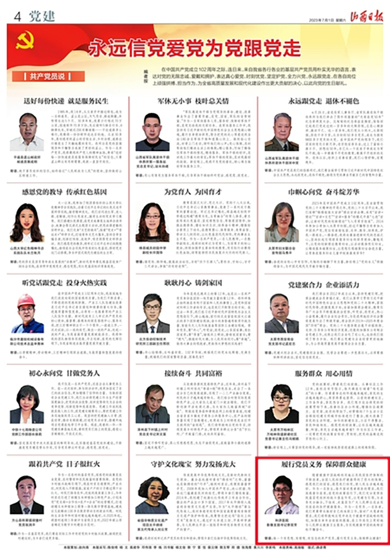 7月1日出版的《山西日报》“党建”专版(第4版),以“永远信党爱党为党跟党走”为题报道我省各行各业的基层共产党员用朴实无华的语言向党的生日献礼。山西省医院协会常务理事单位——长治医学院附属和济医院影像支部书记李双芳的声音上版——