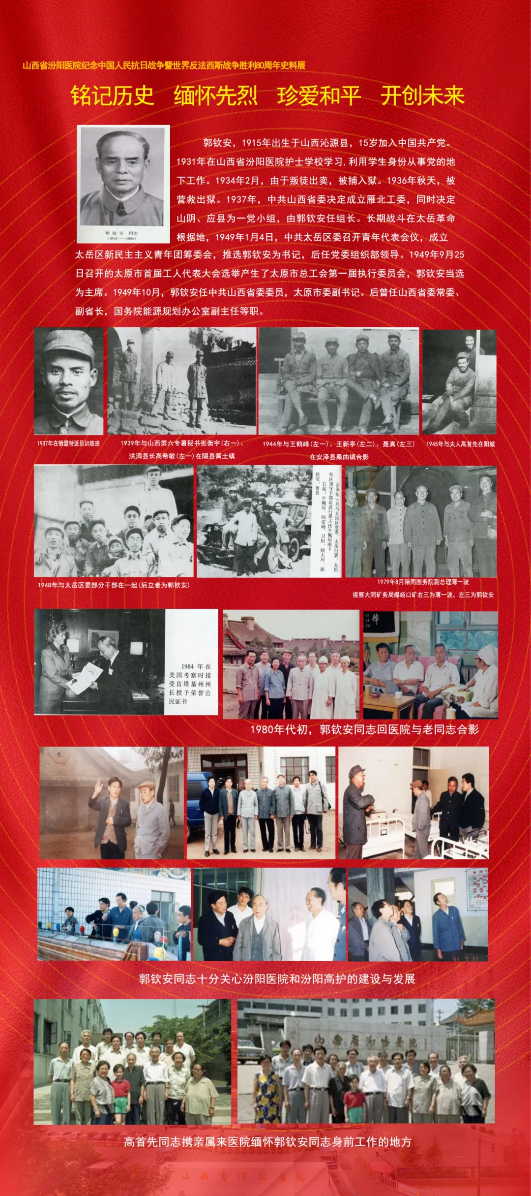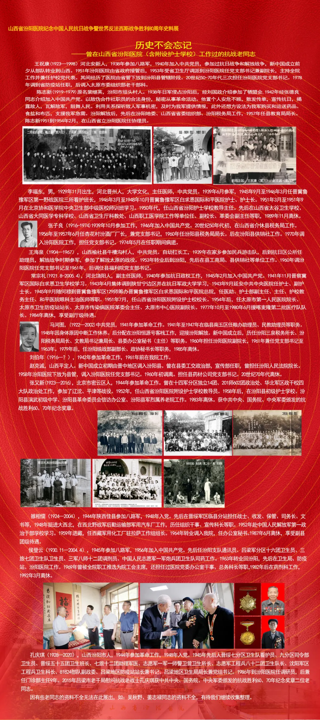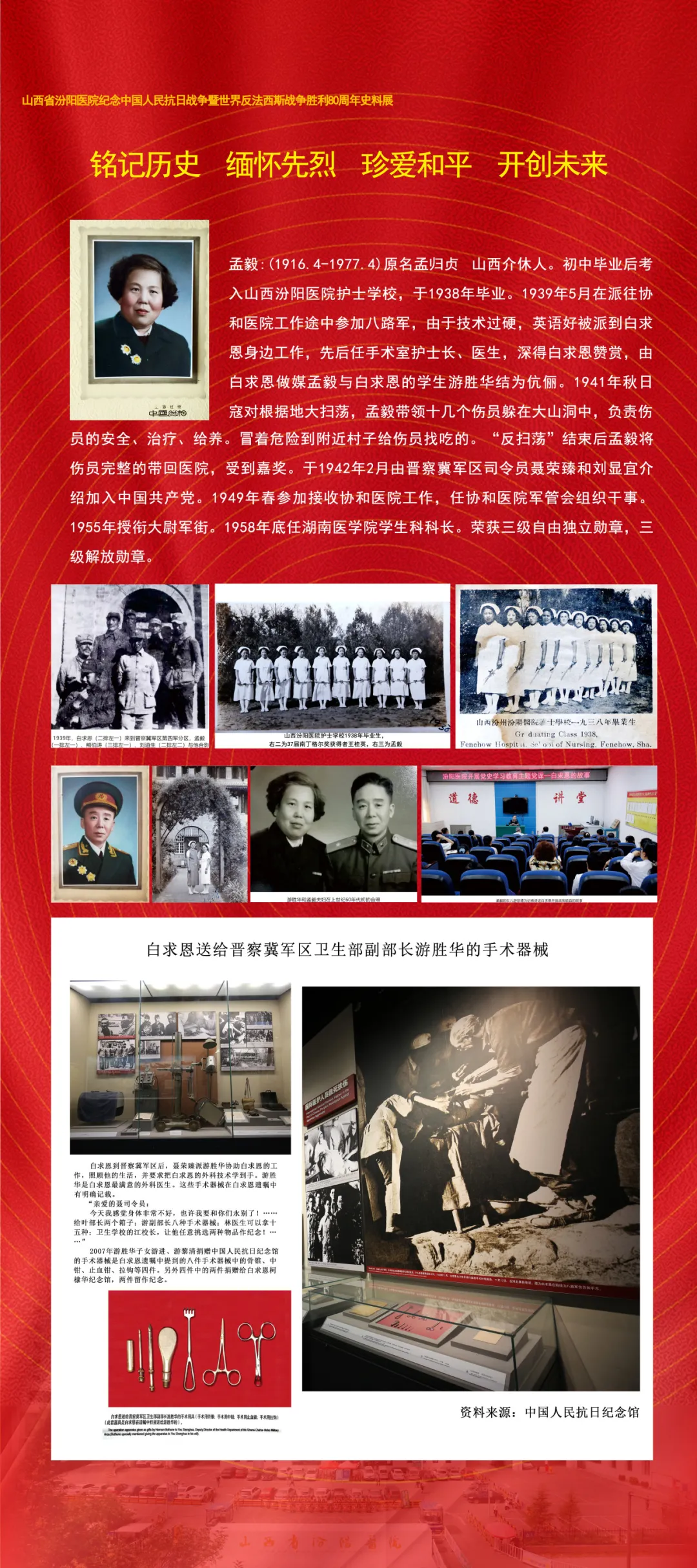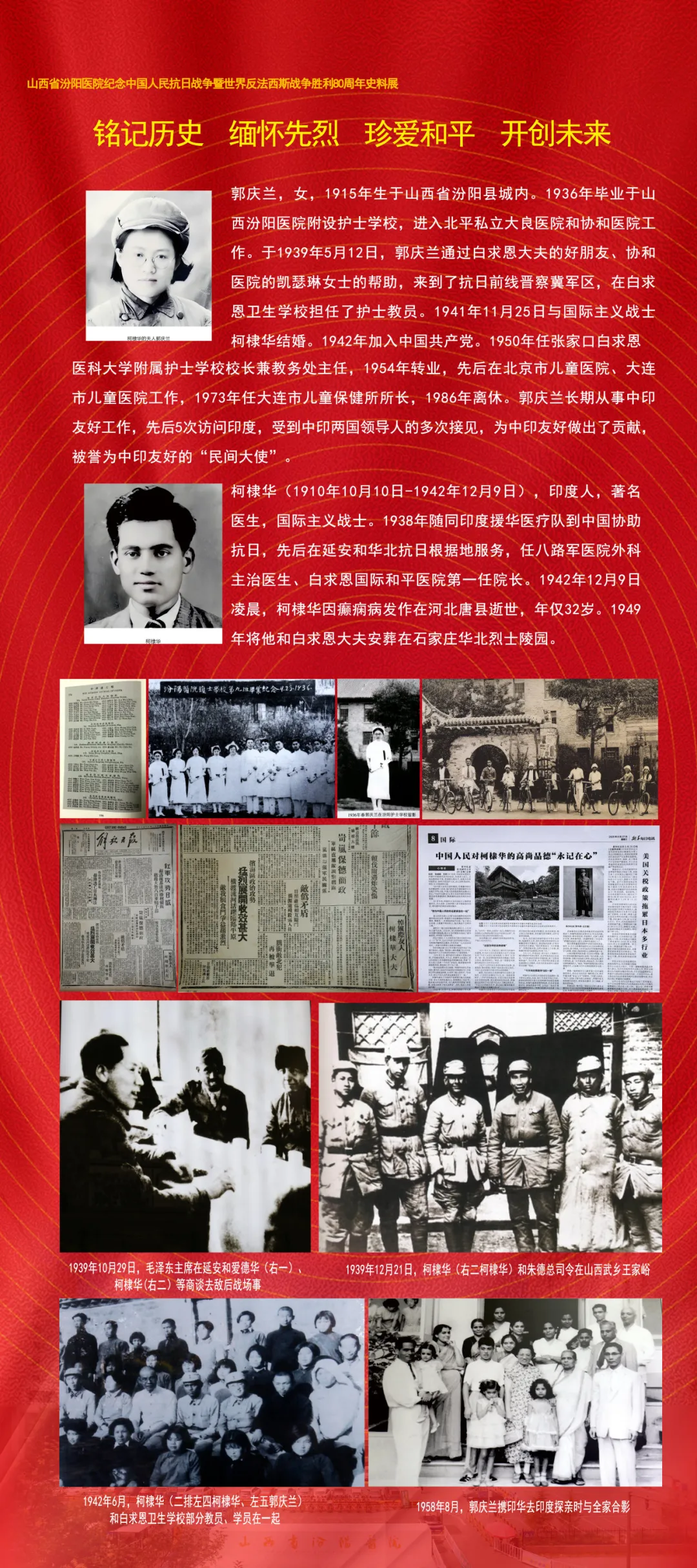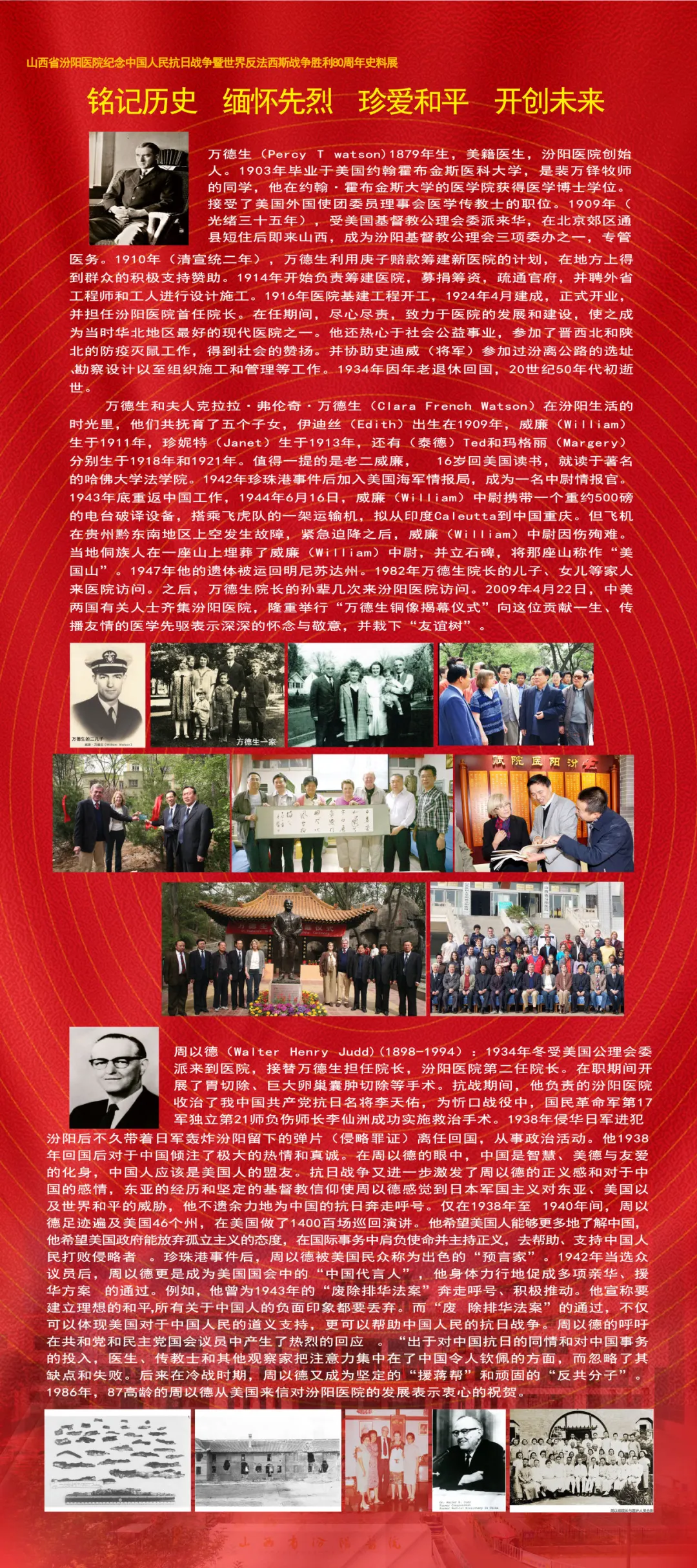 展版介绍了汾阳医院附设护士学校毕业学生郭钦安、郭庆兰、孟毅、白备武以及院长周以德、支援中国抗日的美军情报官威廉·毕德森中尉(万德生院长的二儿子)等抗战英雄的生平与光辉事迹,再现了他们舍生忘死、浴血奋战的壮烈历程。
