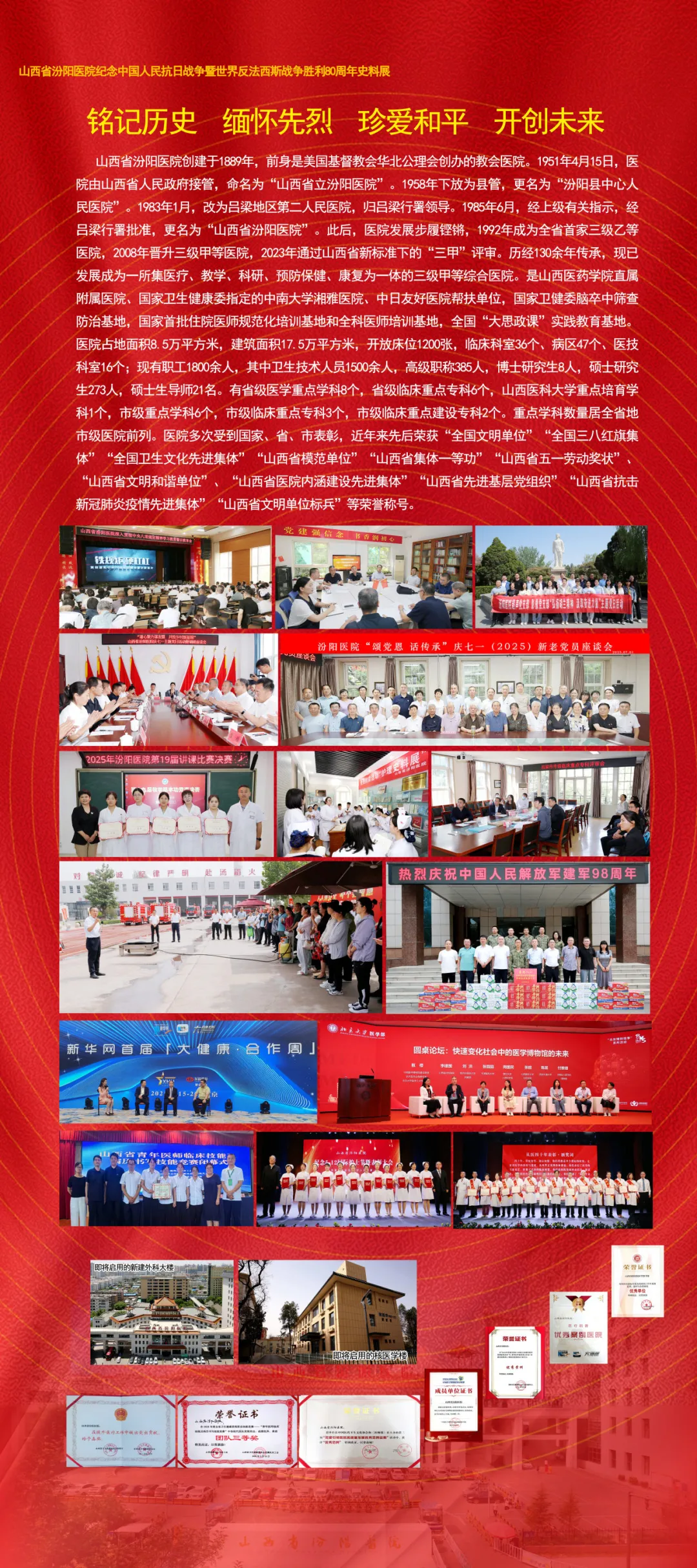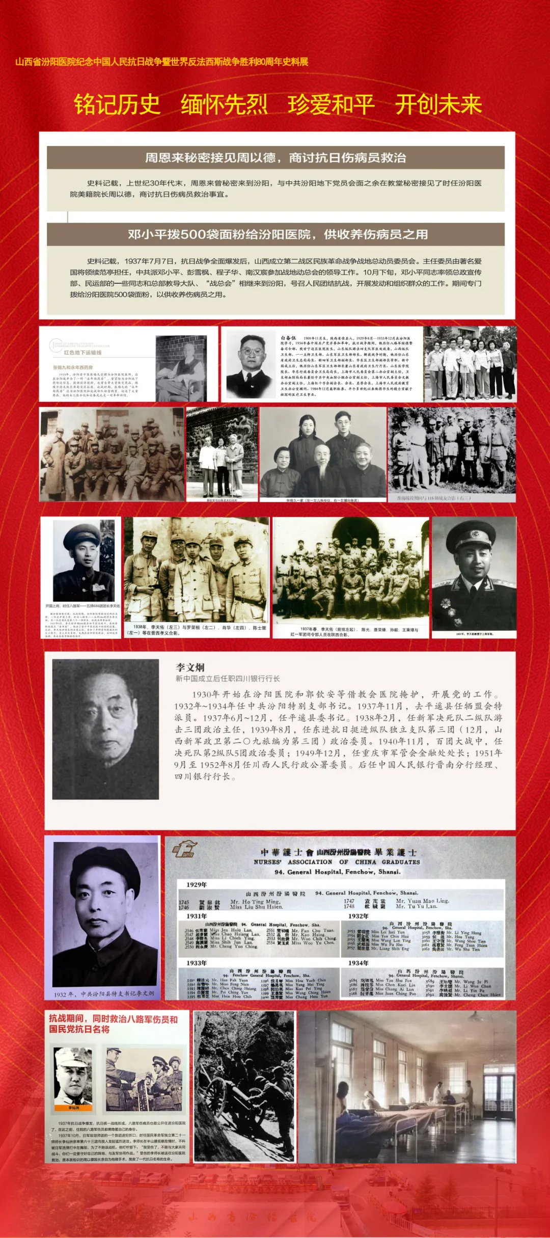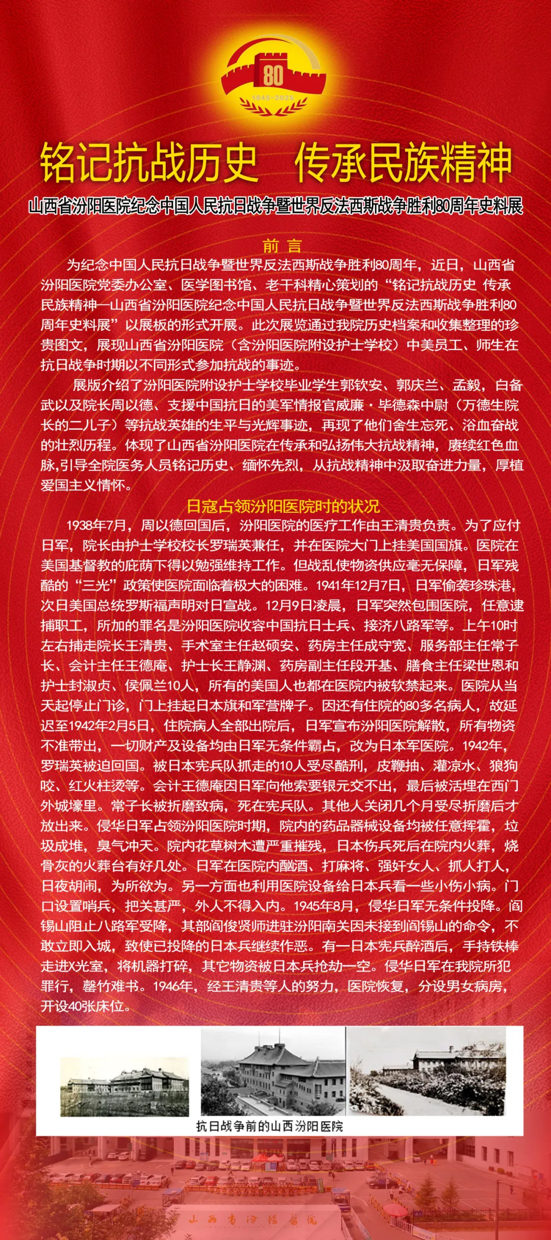 为纪念中国人民抗日战争暨世界反法西斯战争胜利80周年,近日,山西省医院协会常务理事单位——山西省汾阳医院党委办公室、医学图书馆、老干科精心策划的“铭记抗战历史 传承民族精神——山西省汾阳医院纪念中国人民抗日战争暨世界反法西斯战争胜利80周年史料展”以展板的形式开展。此次展览通过该院历史档案和收集整理的珍贵图文,展现了山西省汾阳医院(含汾阳医院附设护士学校)中美员工、师生在抗日战争时期以不同形式参加抗战的事迹。