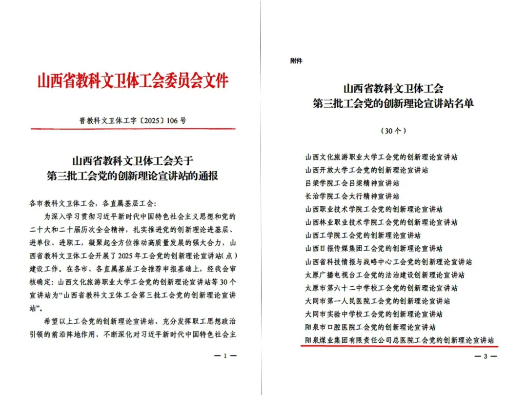 近日,山西省教科文卫体工会公布第三批工会党的创新理论宣讲站认定结果,山西省医院协会常务理事单位——阳泉煤业(集团)有限责任公司总医院(简称阳煤集团总医院)工会党的创新理论宣讲站成功入选。