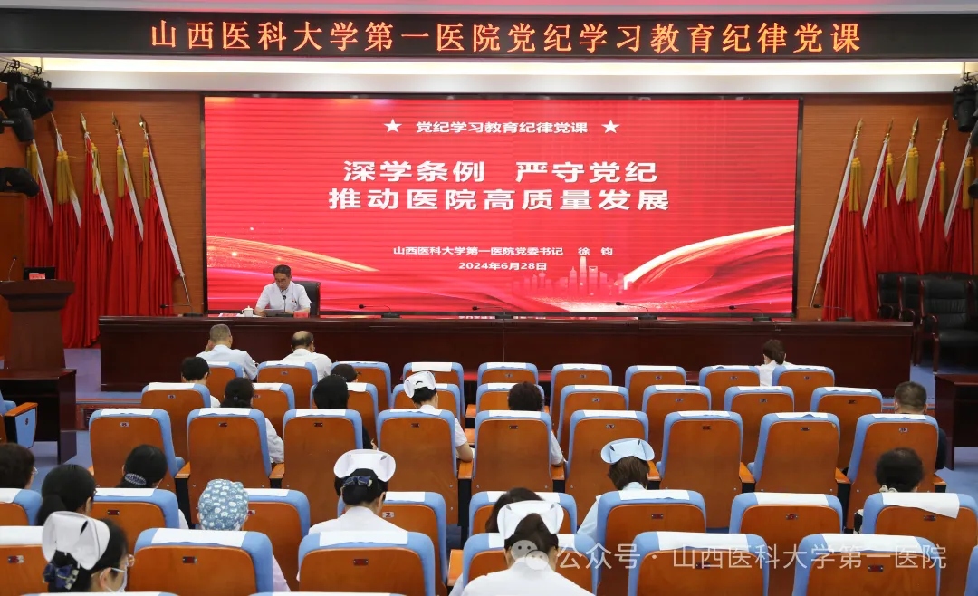 为深入学习贯彻习近平总书记关于全面加强党的纪律建设的重要论述,推动党纪学习教育走深走实,按照党纪学习教育工作安排,6月28日,山西省医院协会副会长单位——山西医科大学第一医院党委书记徐钧以“深学条例 严守党纪 推动医院高质量发展”为题,为全院党支部书记、科主任、护士长共200余人讲授党纪学习教育纪律党课。院党委副书记吴旭东主持。院党委委员、副院长范双民、贾红燕参加。