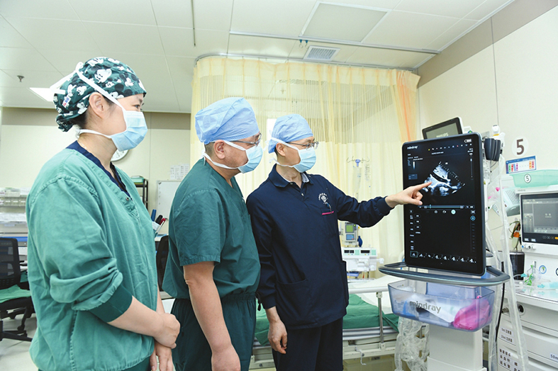 为加强应对突发危重症救治人员储备,保障各种高危、重大手术病人的围术期安全,促进患者术后快速康复,山西省医院协会副会长单位——山西医科大学第二医院成立了山西省首家麻醉重症监护病房(AICU)。完善的术后生理功能监测、床旁超声心肺功能评估等为患者生命安全保驾护航,尤其是超声引导下神经阻滞的多模式镇痛方案,有效降低患者术后疼痛应激反应,缩短卧床时间。监护室成立近半年来,共收治患者500余名,涉及骨科、妇产科、普外科、泌尿外科、血管外科、口腔科等多个科室。图为麻醉科主任张林忠(右一)与AICU医护人员通过超声检查分析病人循环功能状态。(周慧芳 孟亮文/图)