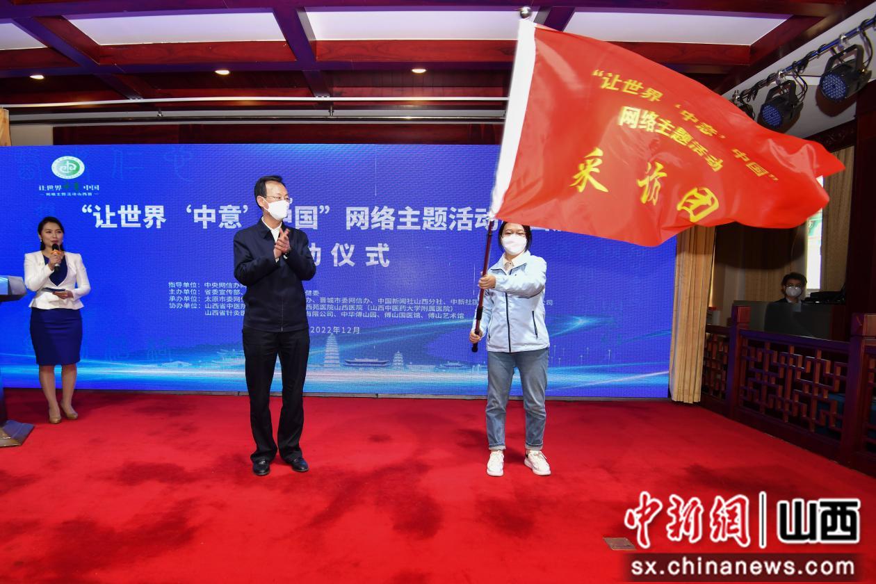 ▲图为省委宣传部副部长张羽为媒体采访团代表授旗。