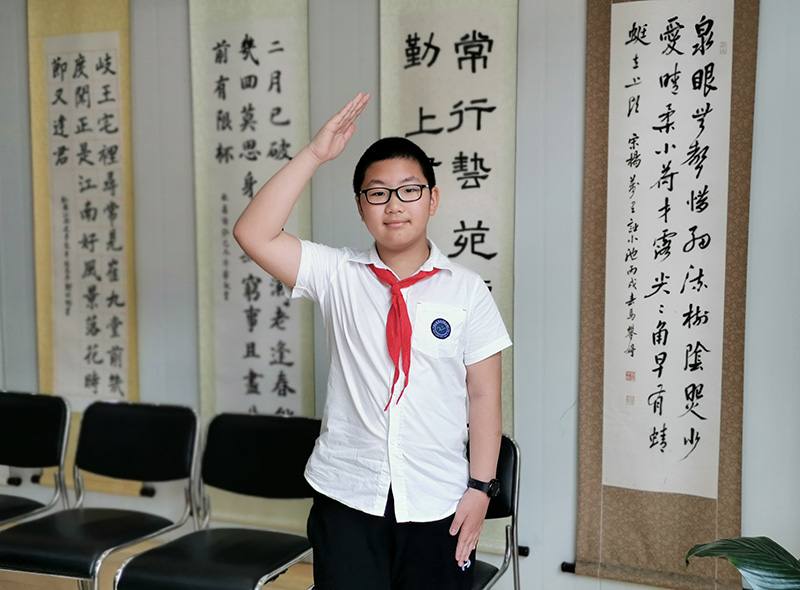 大陈岛老垦荒队员后代、浙江省台州市椒江区实验二小学生李杭骏行队礼(2019年5月27日摄)。