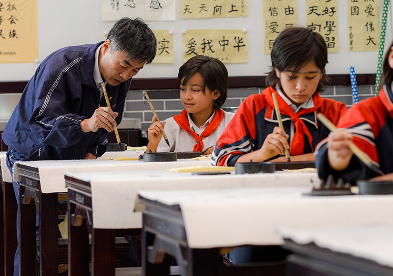 在新疆疏附县托克扎克镇中心小学书法教室内,王庄铁老师在教学生写毛笔字(2017年9月26日摄)。