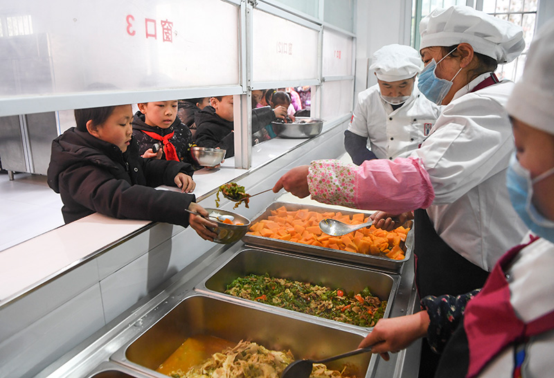 重庆市石柱土家族自治县中益乡小学学生在食堂排队打饭菜(2020年1月10日摄)。