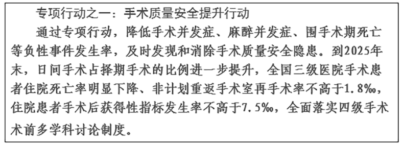 10.保障手术质量安全。医疗机构严格落实手术分级管理制度,强化手术分级和医生授权动态管理,确保三、四级手术逐项授予和动态调整。全面加强手术患者术前评估、麻醉评估,落实术前讨论制度,准确把握手术适应证和禁忌证,科学制订手术方案。严格落实手术安全核查制度,强化围手术期管理。
