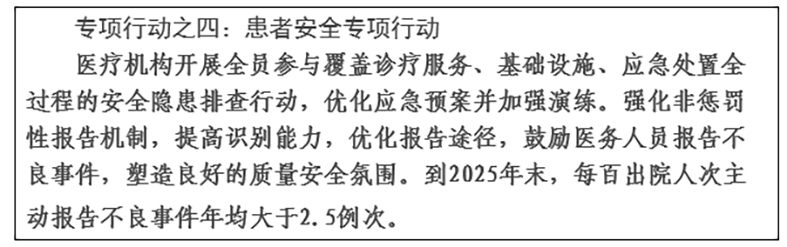 21.强化患者安全管理。医疗机构进一步提升医务人员患者安全意识和对医疗质量(安全)不良事件的识别能力,强化医疗质量(安全)不良事件的主动报告,定期对患者医疗质量(安全)不良事件发生情况进行分析,查找存在的共性问题和薄弱环节,开展系统性改进工作。