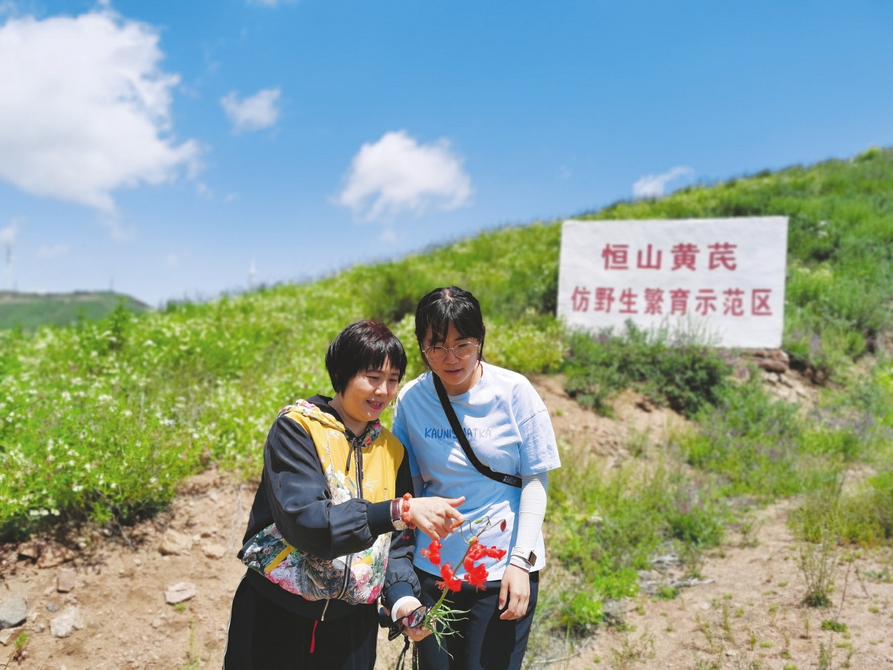 ▲秦雪梅教授(左)在恒山黄芪仿野生繁育示范区工作。