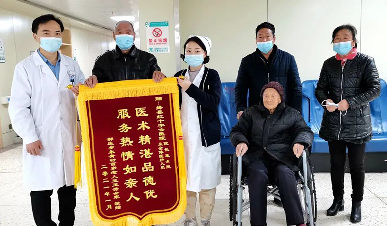 ▲百岁老人及她的亲人向绛县健康医院送锦旗表达谢意。