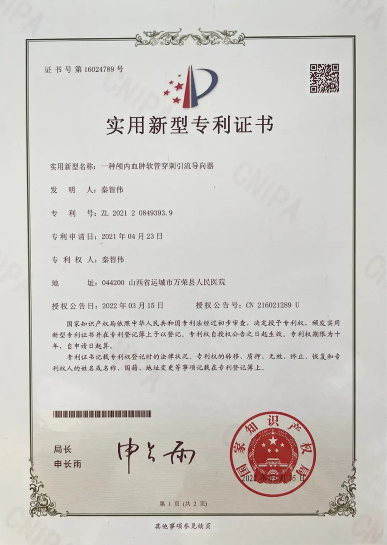 12月8日,山西省医院协会理事单位——万荣县人民医院发布消息,该院神经外科主任秦智伟的临床发明《一种颅内血肿软管穿刺引流导向器》获得《实用新型专利证书》。该工具解决了基层医院没有脑立体定向仪,也能达到比较精准穿刺血肿的目标,是该神经外科全体医师在特聘专家史益民主任的指导下,经过多次临床实践总结的成果。