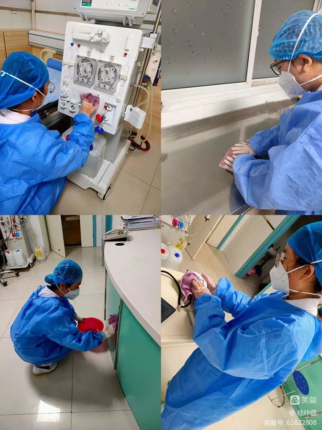 透析结束后彻底清场消杀,开窗通风,擦拭使用的机器、血压计、治疗车,更换床单,被套,枕套等,大家心里只有一个信念,那就是做好一切细节工作,最大程度保证患者、家属及医护人员的安全。