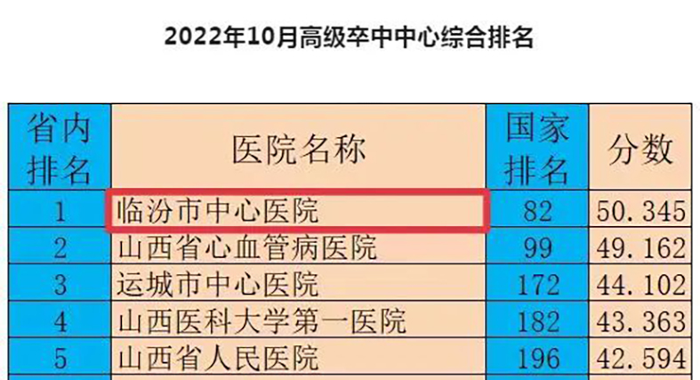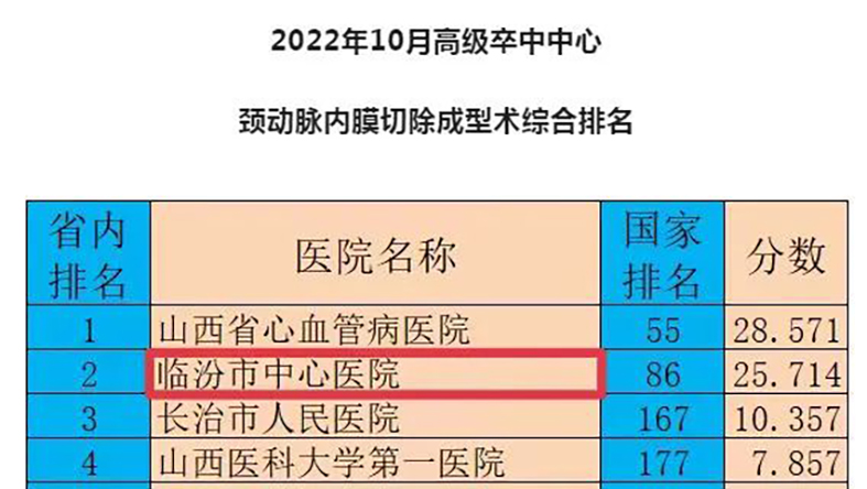 近日,2022年10月全国高级卒中中心综合质控排名、专业技术专项排名出炉。山西省医院协会理事单位——临汾市中心医院高级卒中中心综合排名全国第82名、山西省第1名,多个专业技术专项也取得优异成绩,其中,静脉溶栓技术全国排名第22名、山西省第1名;颈动脉内膜切除成形术全国排名第86名,山西省第2名。