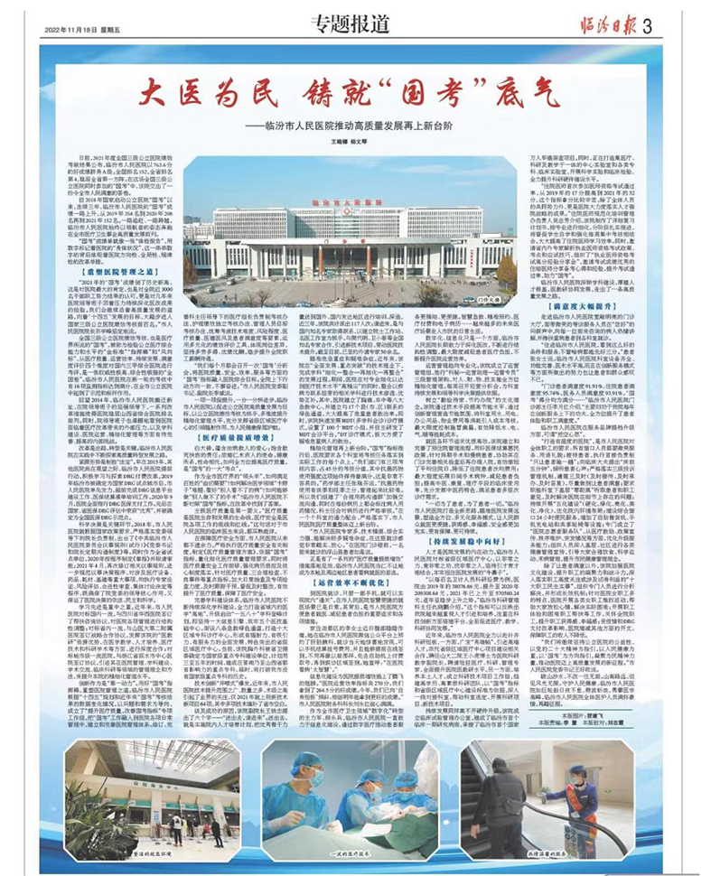 11月18日,《临汾日报》在第三版整版以《大医为民 铸就“国考”底气》为题,对临汾市人民医院高质量发展作了专题报道。
