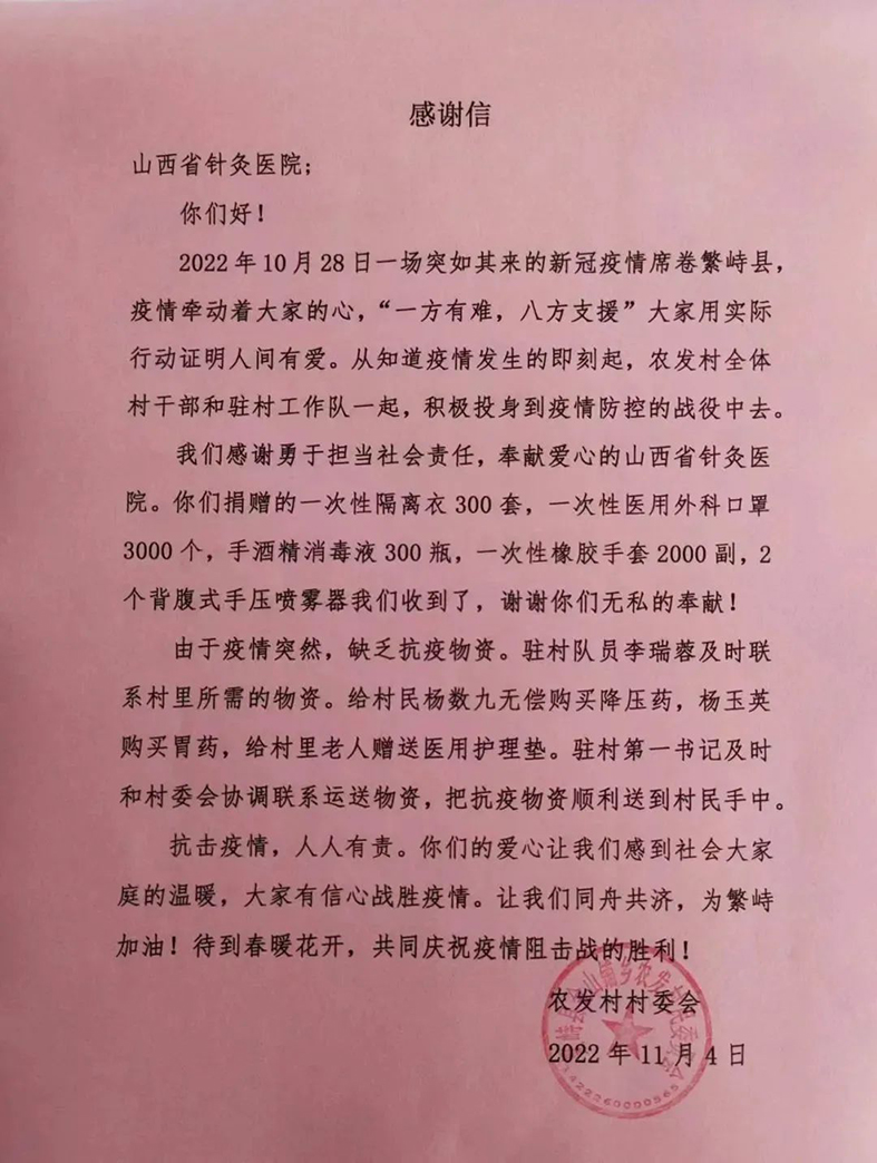 ▲农发村写给山西省针灸医院的感谢信。