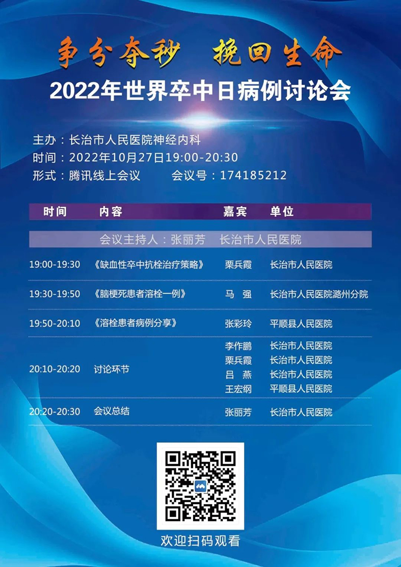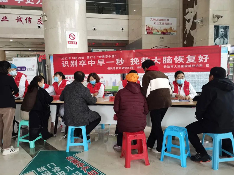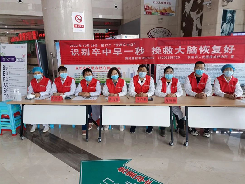 为切实提高人民群众脑卒中防治知晓率、提高各级医务人员对超早期缺血性脑卒中治疗的认识,做到争分夺秒,挽回生命,山西省医院协会理事单位——长治市人民医院开展在“世界卒中日”(2022年10月29日为第17个“世界卒中日”)期间举办了系列宣传活动。