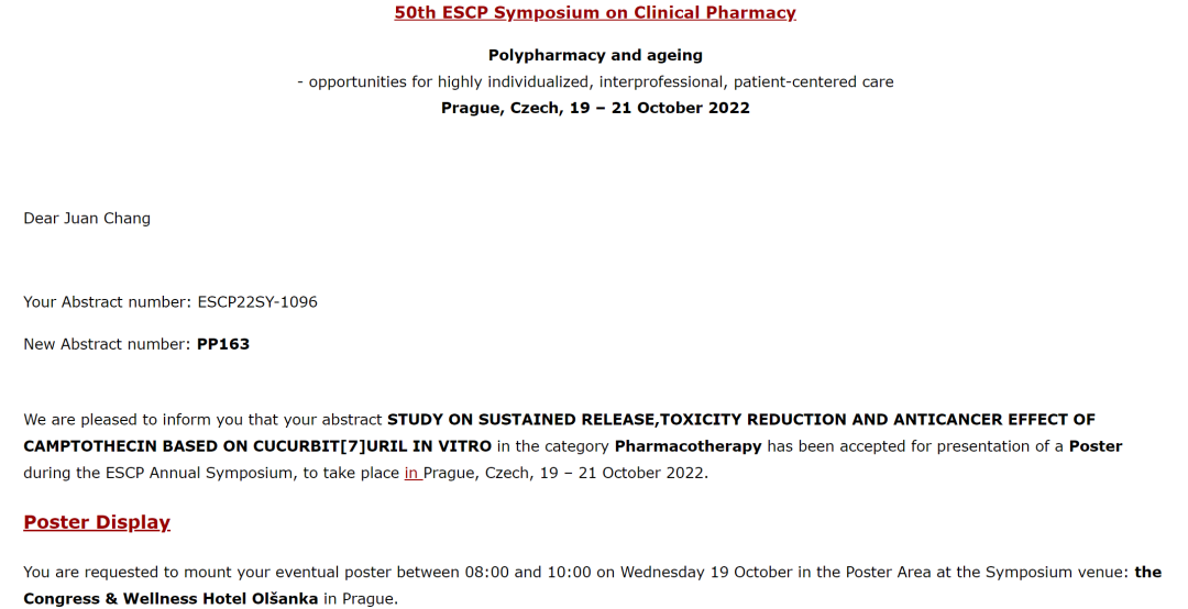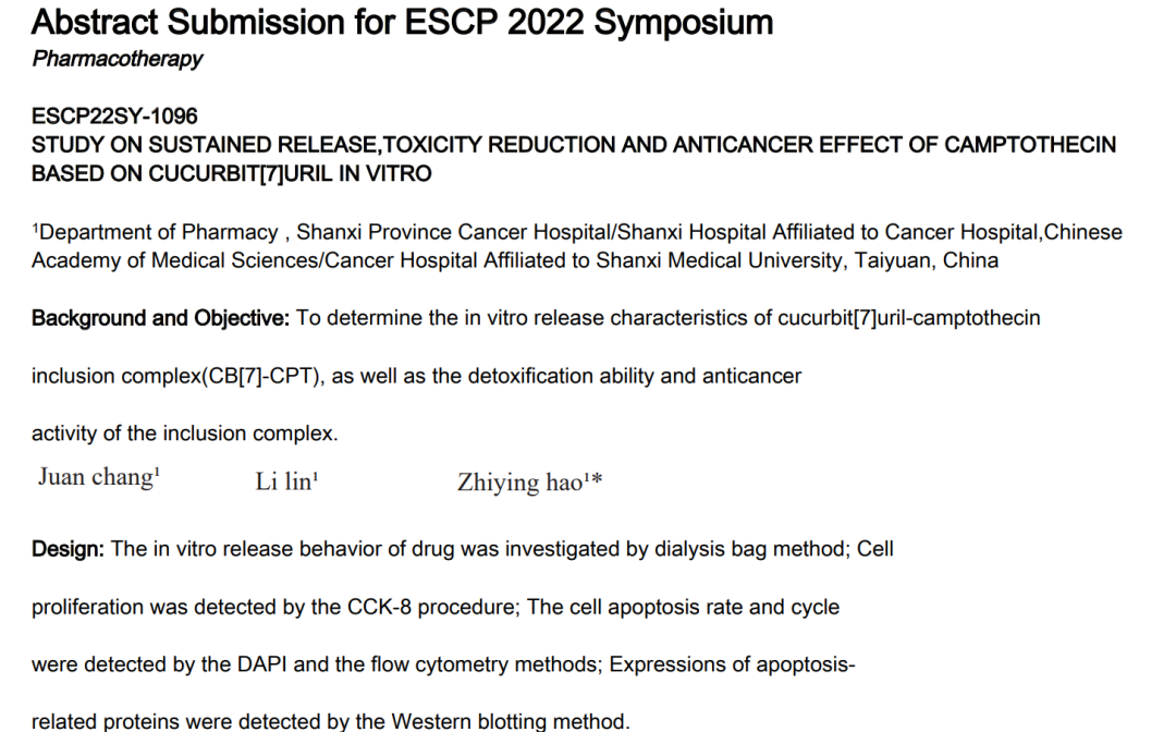 本届大会山西省医院协会理事单位——山西省肿瘤医院药学部郝志英课题组1项研究入选:STUDY ON SUSTAINED RELEASE,TOXICITY REDUCTION AND ANTICANCER EFFECT OF CAMPTOTHECIN BASED ON CUCURBIT[7]URIL IN VITRO,其摘要也在国际临床药学杂志(IJCP)同步发表。