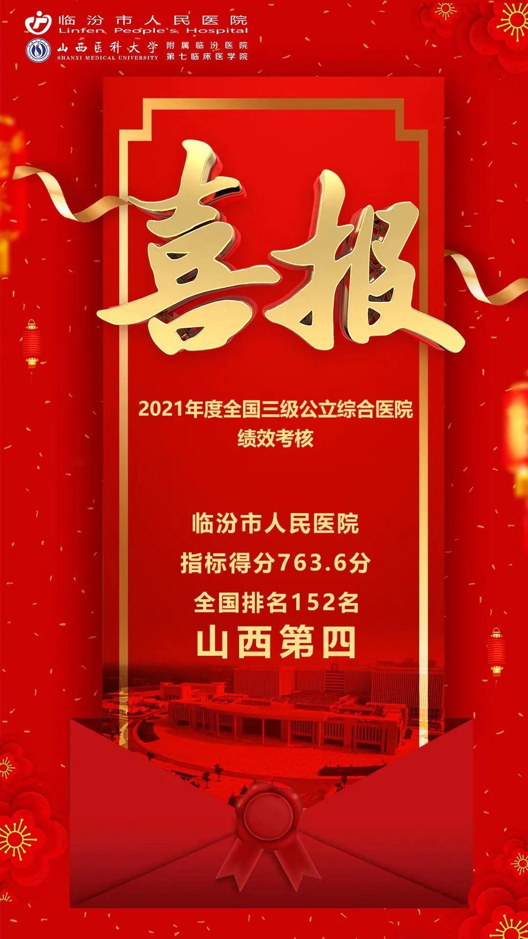 日前,2021年度国家三级公立医院绩效考核结果公布,山西省医院协会理事单位——临汾市人民医院指标得分763.6分,全国排名第152名,全省第4名,取得历史最好成绩。
