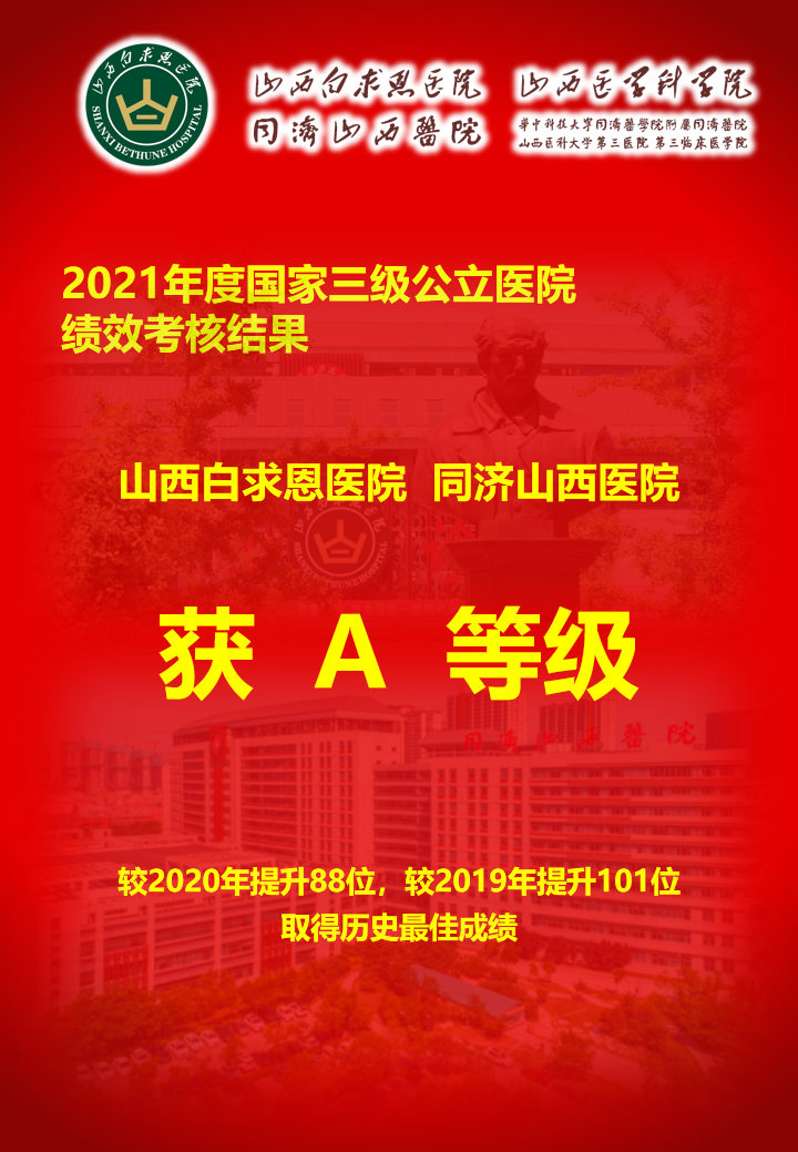 9月30日,国家卫生健康委公布了2021年度三级公立医院绩效考核成绩单,山西省医院协会理事单位——山西白求恩医院 同济山西医院在参评的1355家三级公立医院中获评A等级,较2020年提升88位,较2019年提升101位,取得历史最佳成绩。我院在医疗质量、运营效率、持续发展、满意度评价四个维度得分均有长足进步,表明医院医疗服务质量、运营效率、精细化管理持续改进卓有成效,综合服务能力显著提升!
