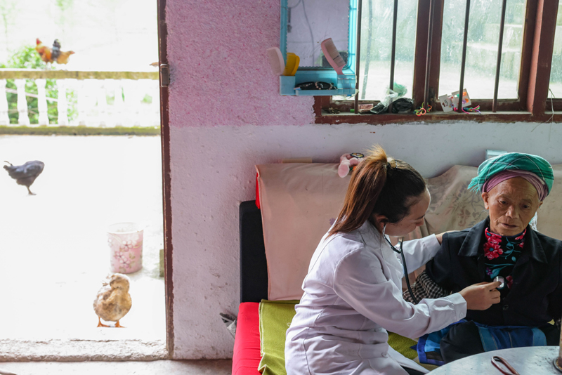 6月7日,龙里县龙山镇团结村卫生室村医陈莉(左)为村民陈志珍听诊。