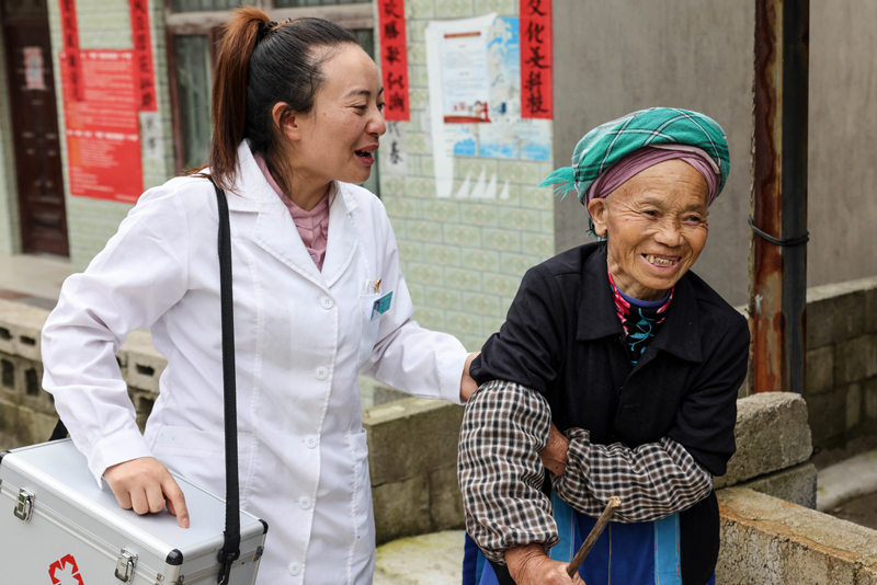 6月7日,龙里县龙山镇团结村卫生室村医陈莉(左)搀扶村民陈志珍走向村卫生室,准备通过远程诊断系统问诊。