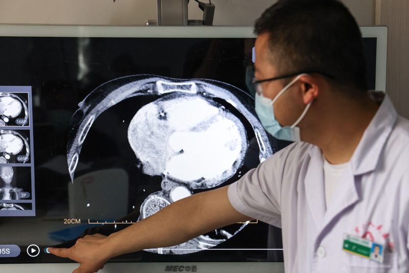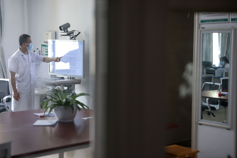 6月7日,龙里县人民医院呼吸科主任田广通过远程诊断系统查看患者的医学影像资料。