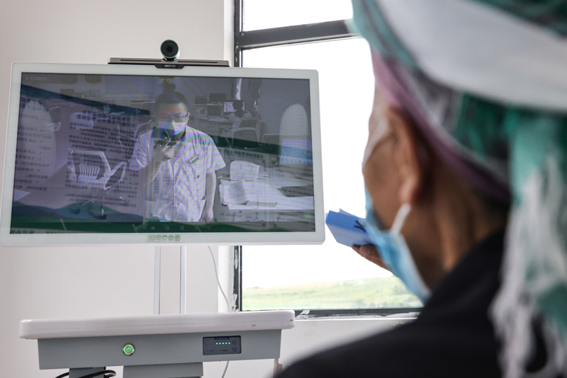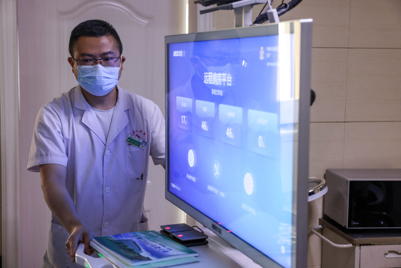 6月7日,龙里县人民医院呼吸科主任田广将远程诊断系统推入病房。