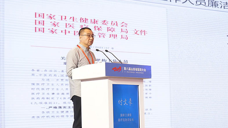 ▲国家卫健委医疗应急司付文豪处长作《加强行业作风建设推进健康中国事业高质量发展》报告
