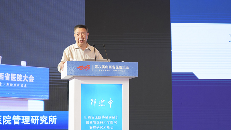 ▲山西医科大学医院管理研究所所长郑建中以《对“完善我国医疗卫生服务体系”的思考》为题作报告