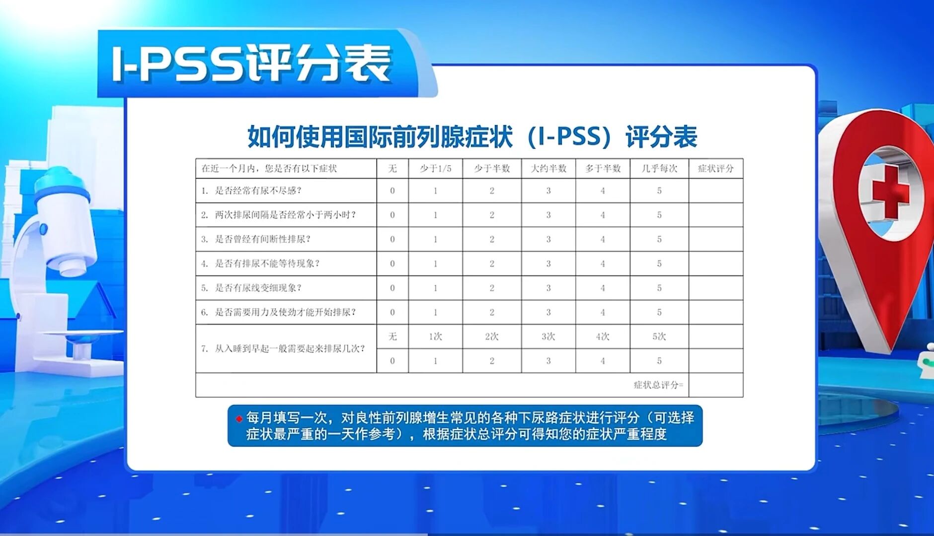 此外,还可以根据国际前列腺症状(I-PSS)进行自我评分,对7个问题进行打分,0—7分是轻度,8—19分是中度,20—35分是重度。